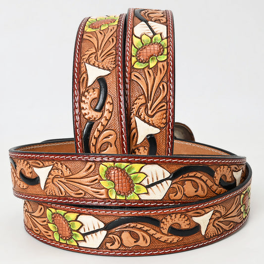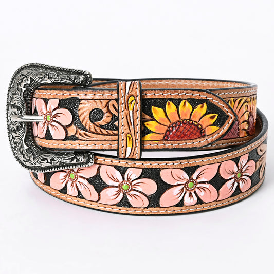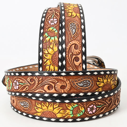 LC-ADBLF130 Hand Tooled Leather Western Belt - Sunflower, Paisley & Floral Pattern with Silver Buckle