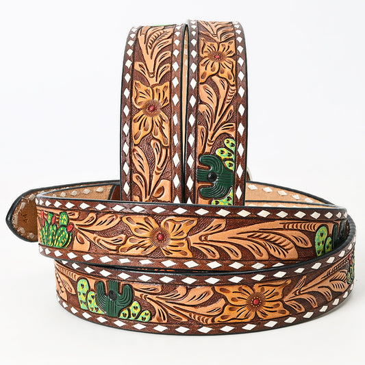 LC-ADBLF129 Hand Tooled Leather Western Belt - Floral & Cactus Design