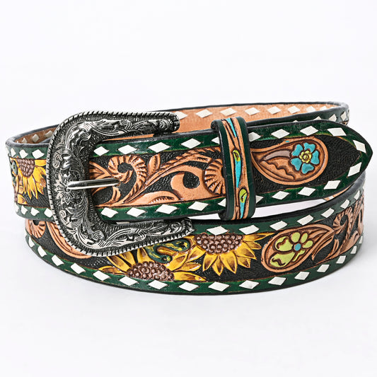 LC-ADBLF133 Tooled Leather Western Belt - Sunflower & Floral Scroll with Green Diamond Border
