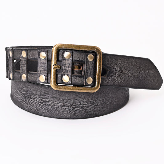 LC-ADBLF201 Black Vintage Leather Belt with Studded Cage Design and Antique Brass Buckle