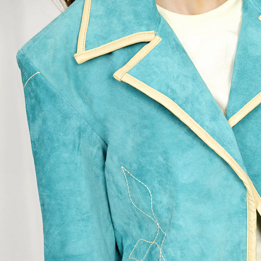LC-ADBZ704 Emerald Green Western Blazer with Tan Tooled Leather Lapel - Cowgirl Boutique Jacket
