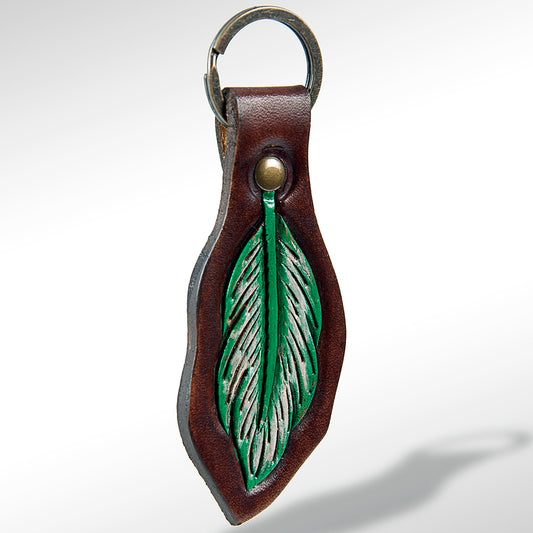LC-ADKR162 Tooled Leather Feather Keyring Green & White Western Design