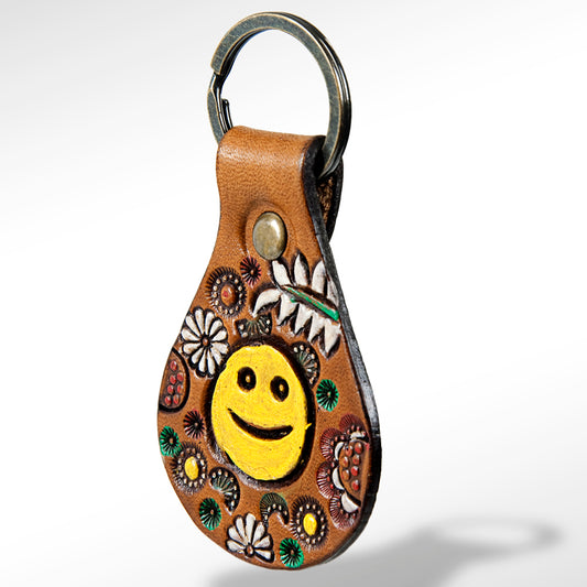 LC-ADKR152 Tooled Leather Keyring Smiley Face & Floral Design
