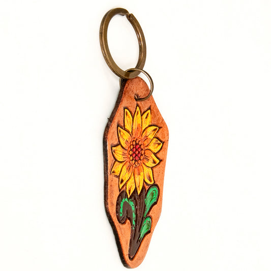 LC-ADKR201 Hand-Tooled Leather Sunflower Keyring Freeform Shape with Bold Yellow Petals
