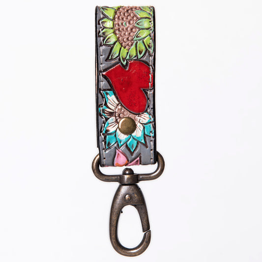 LC-ADKR210S Hand-Tooled Leather keyring Red Heart & Sunflower Floral on Charcoal