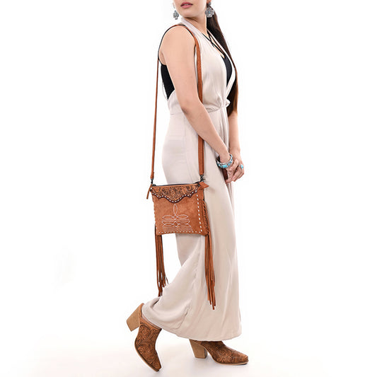 ADBG1654 Tan Genuine suede Crossbody Bag with Tooled Leather, Fringe & White Embroidery