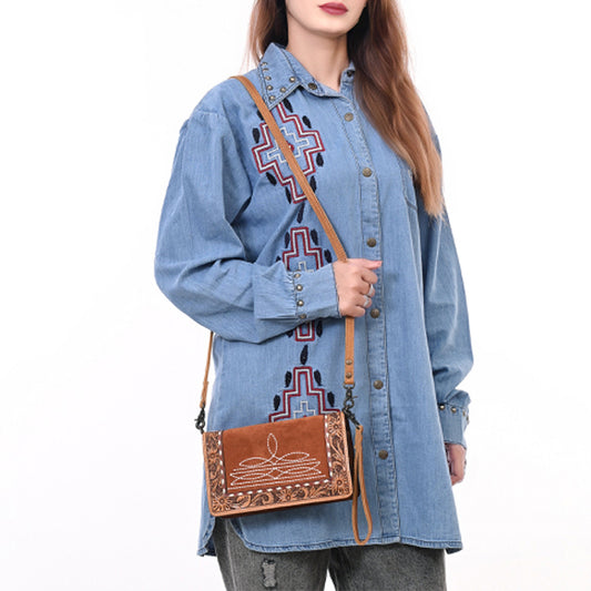 ADBG1648 Brown Genuine suede Fringe Crossbody Bag with Tooled Leather Yoke & White Embroidery