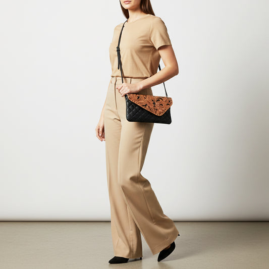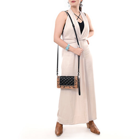 ADBG1672 Tooled Leather Black Quilted Crossbody Wallet with Floral Flap - American Darling
