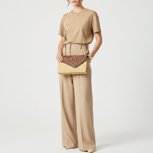 ADBG1672A Tooled Leather Tan Quilted Crossbody Wallet with Sunflower Flap - American Darling
