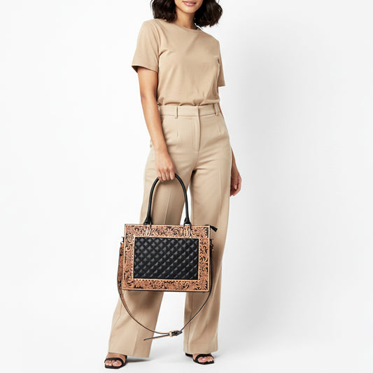 ADBG1671 Tooled Leather Black Quilted Western Tote Bag with Floral Strap - American Darling