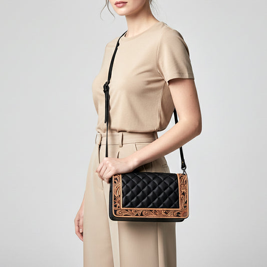 ADBG1668 Black Quilted Fringe Crossbody Bag with Tooled Leather Floral Panel