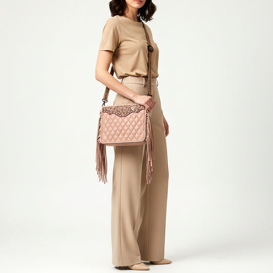 ADBG1664A Pink Quilted Crossbody Bag with Tooled Leather Strap & Fringe
