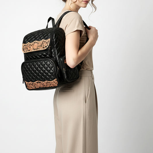ADBG1674 Black Quilted Leather Backpack with Floral Tooled Accents - American Darling