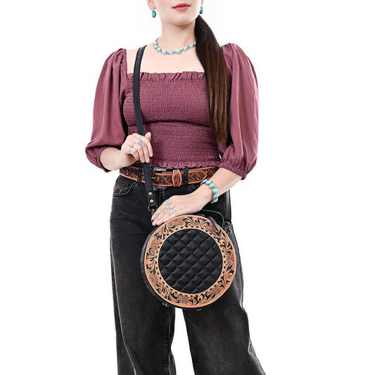 ADBG1684 Round Black Quilted Leather Canteen Bag with Floral Tooled Border - American Darling