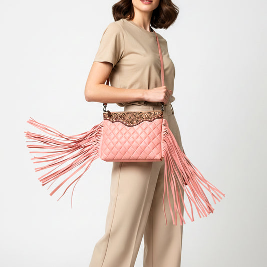 ADBG1683A Pink Quilted Leather Fringe Crossbody Bag with Tooled Floral Top - American Darling