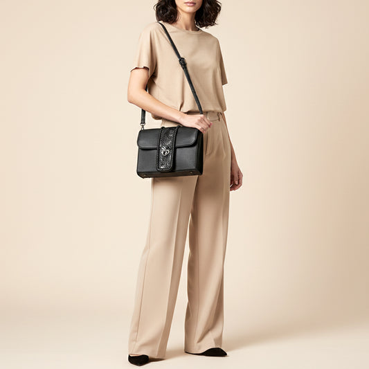 ADBG1694 Black Leather Crossbody Bag with Tooled Strap and Turn-Lock Closure