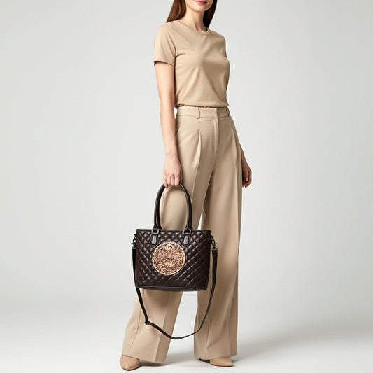 ADBG1689 Dark Brown Quilted Leather Tote Bag with Tooled Round Floral Medallion - American Darling