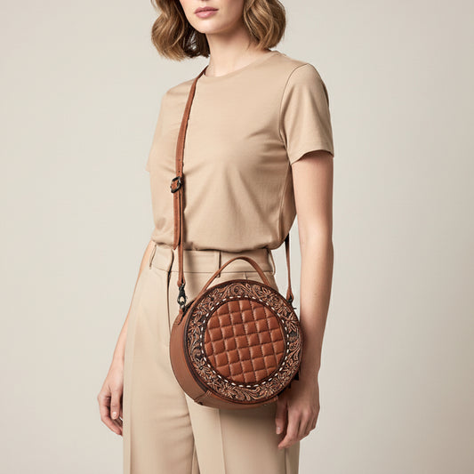 ADBG1684A Round Quilted Leather Canteen Bag with Floral Tooled Border - American Darling