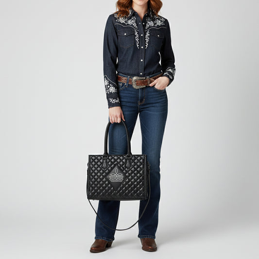 ADBG1703 Quilted Black Leather Western Tote Bag - Designer Embroidered Luxury Purse for Women