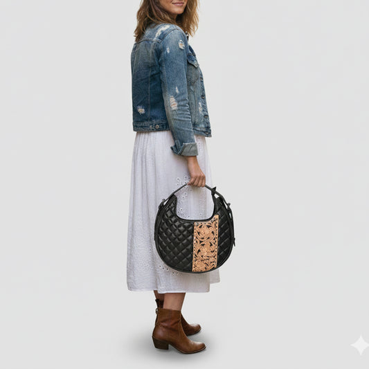 ADBG1705 Quilted Black Leather Hobo Bag with Hand-Tooled Floral Leather Accent & Adjustable Strap
