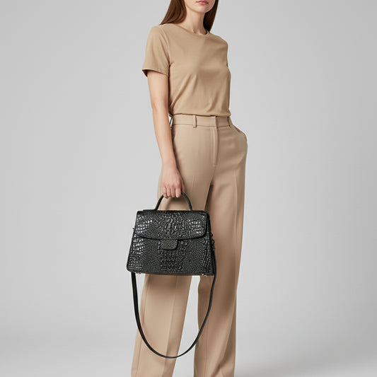 ADBG1737 Black Embossed Croc-Pattern Leather Tote with Dual Handles & Crossbody Strap