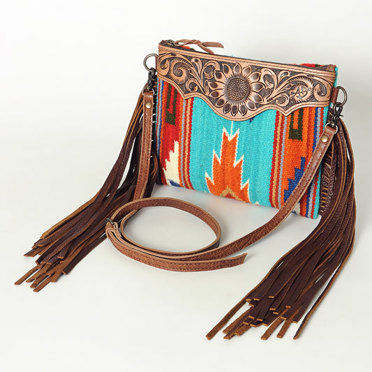 ADBG217 Handwoven Wool Saddle Blanket Western Crossbody Bag with Tooled Leather Strap & Fringe