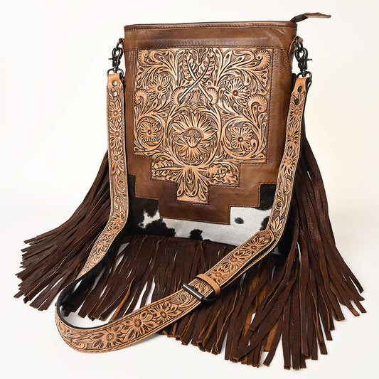 ADBG256 Tooled Leather & Cowhide Fringe Messenger Bag Western Boho Messenger by American Darling