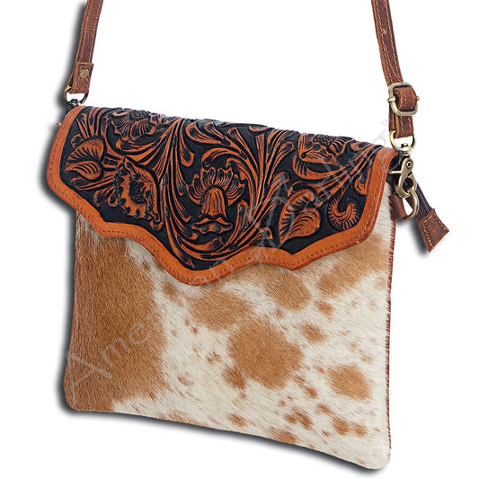 ADBG397 Taco-Shaped Hair-On Cowhide Leather Wristlet Western Tooled Genuine Leather Clutch