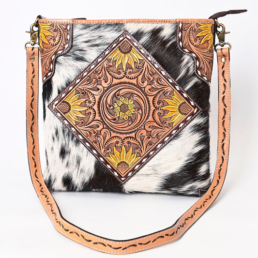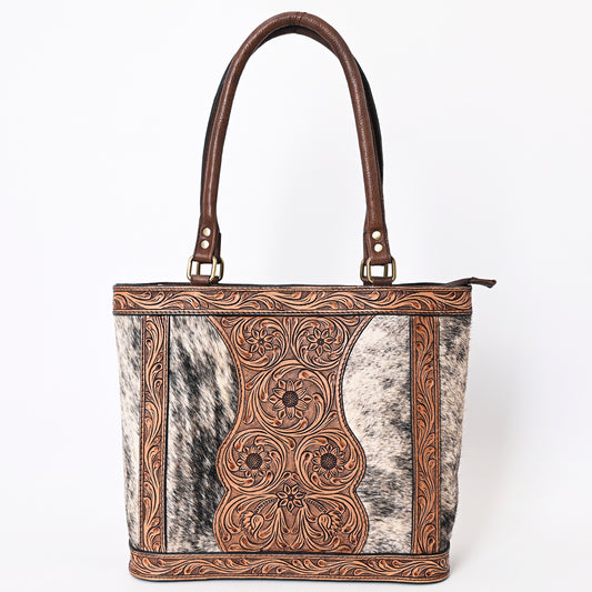 ADBGA339 Hair-On Cowhide Tote Bag with Hand-Tooled Leather Floral Accents