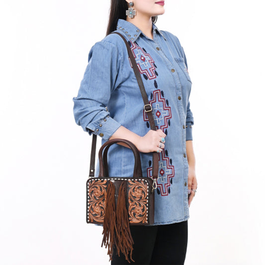 ADBGA618 Tooled Leather Crossbody Bag with Fringe-Genuine Western Cowgirl Purse