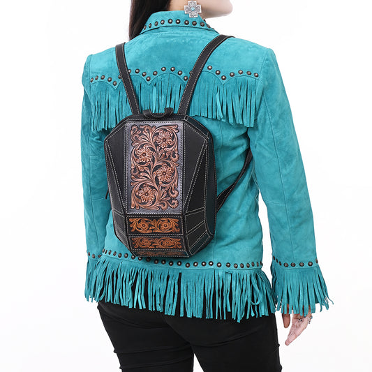 ADBGA680 Hand-Tooled Black Leather Western Backpack with Floral Carving