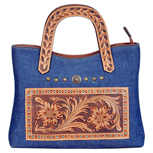 ADBGA998 Bucket Hand Tooled Denim Fabric Genuine Leather Women Bag