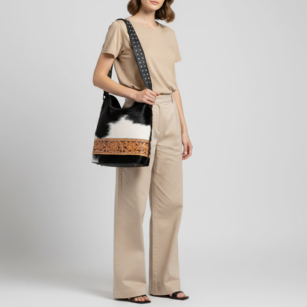 Premium Quality Material: This luxurious hobo bag is made from eco-friendly, genuine leather and hair-on cowhide. The intricate hand-tooled floral design adds a touch of Western charm, making this bag a standout piece.