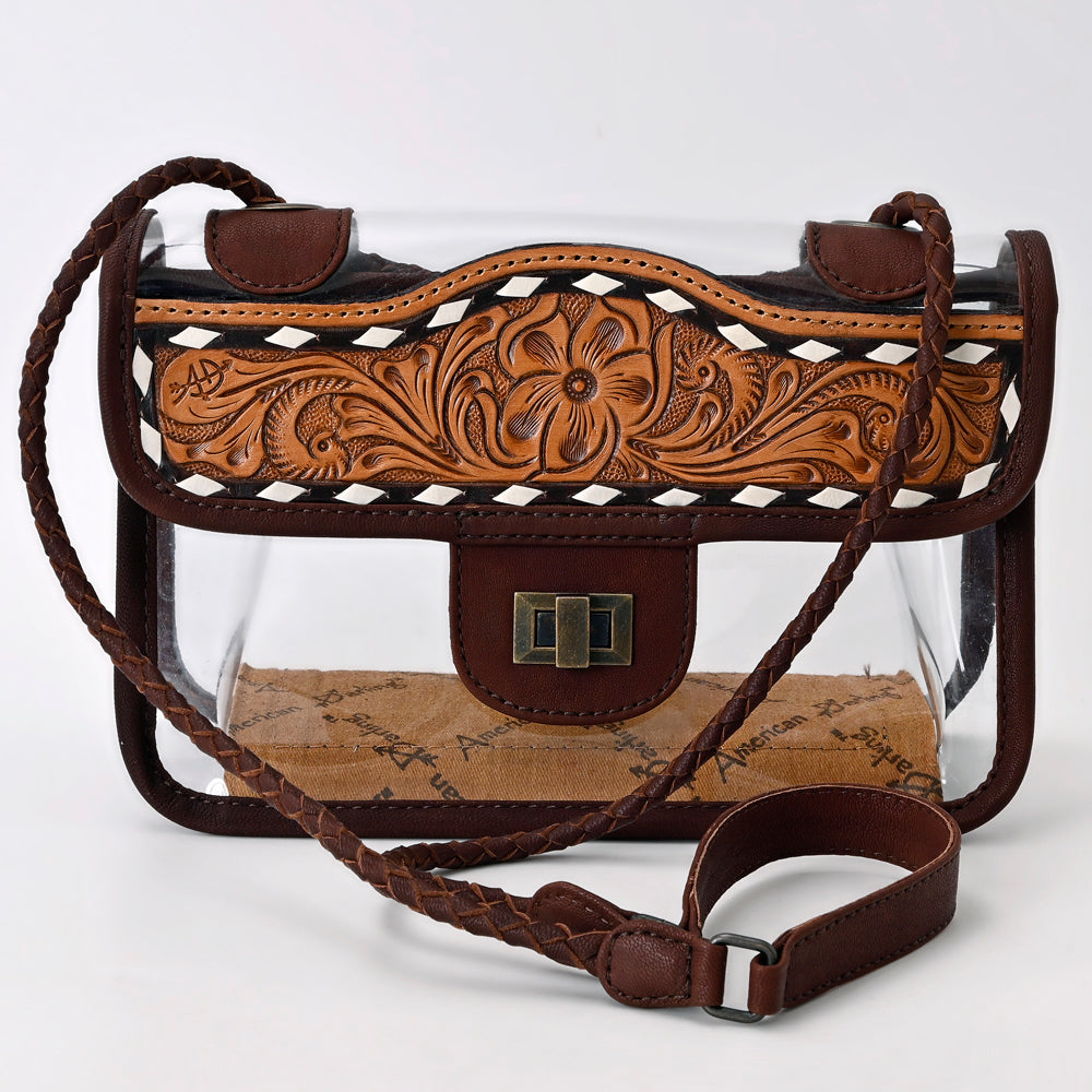 Meet venue-approved style with this stunning American Darling clear bag. This piece elevates the standard stadium bag with genuine, premium leather trim and a breathtaking, hand-tooled floral carved flap, showcasing true Western artistry. The durable, transparent body is compliant with most clear bag policies, while the supple, braided genuine leather strap is adjustable for comfortable, hands-free wear as a crossbody or shoulder bag.