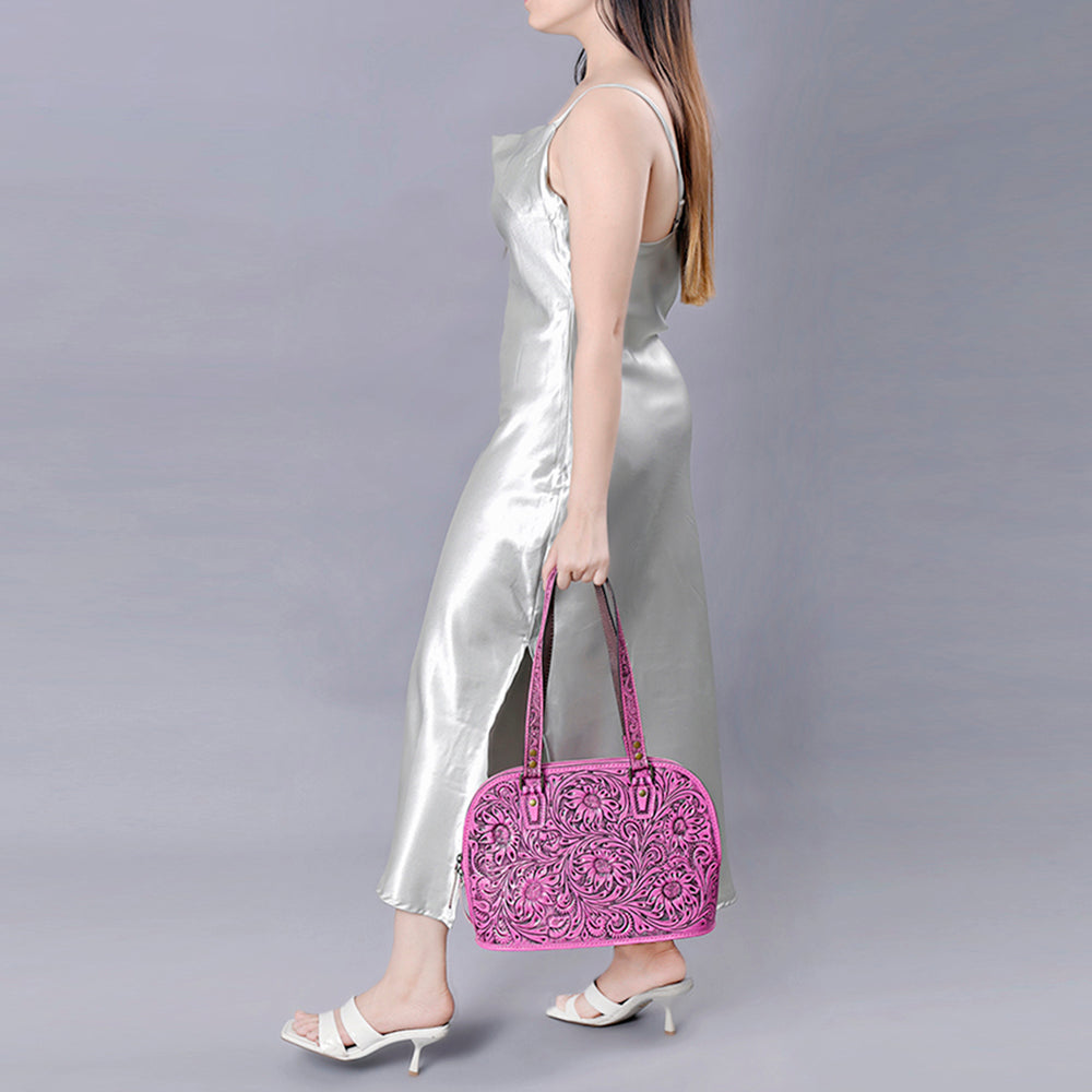 - Material: Genuine full-grain leather dyed pink with floral tooling.