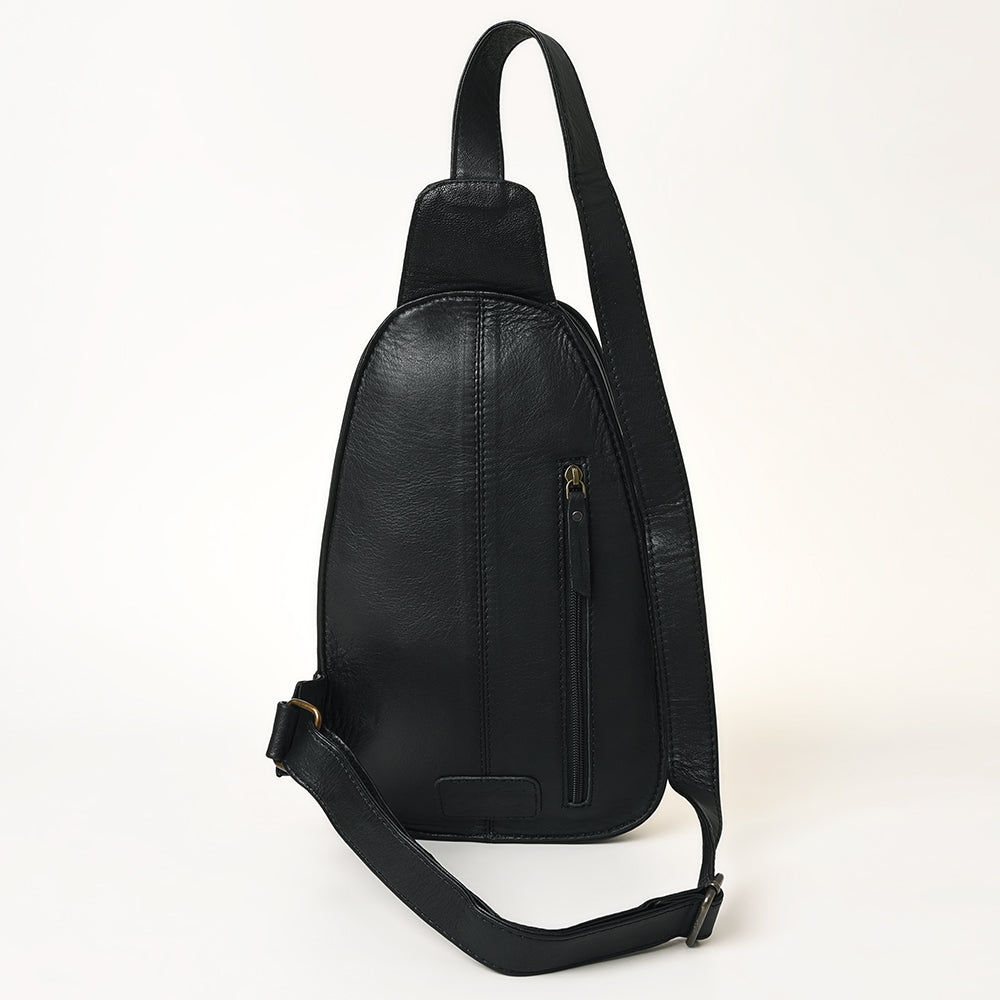 - Single adjustable leather strap for versatile sling or crossbody wear.