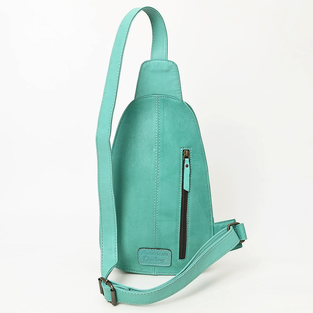 Illuminate your Western wardrobe with this vibrant sling backpack from American Darling. This piece is a masterclass in mixed-media design, featuring a striking body of yellow hair-on cowhide with unique silver speckles. The front zipper pocket is the star of the show, crafted from rich genuine leather and hand-tooled with an intricate motif. It’s a rugged yet sunny accessory designed for the bold spirit.