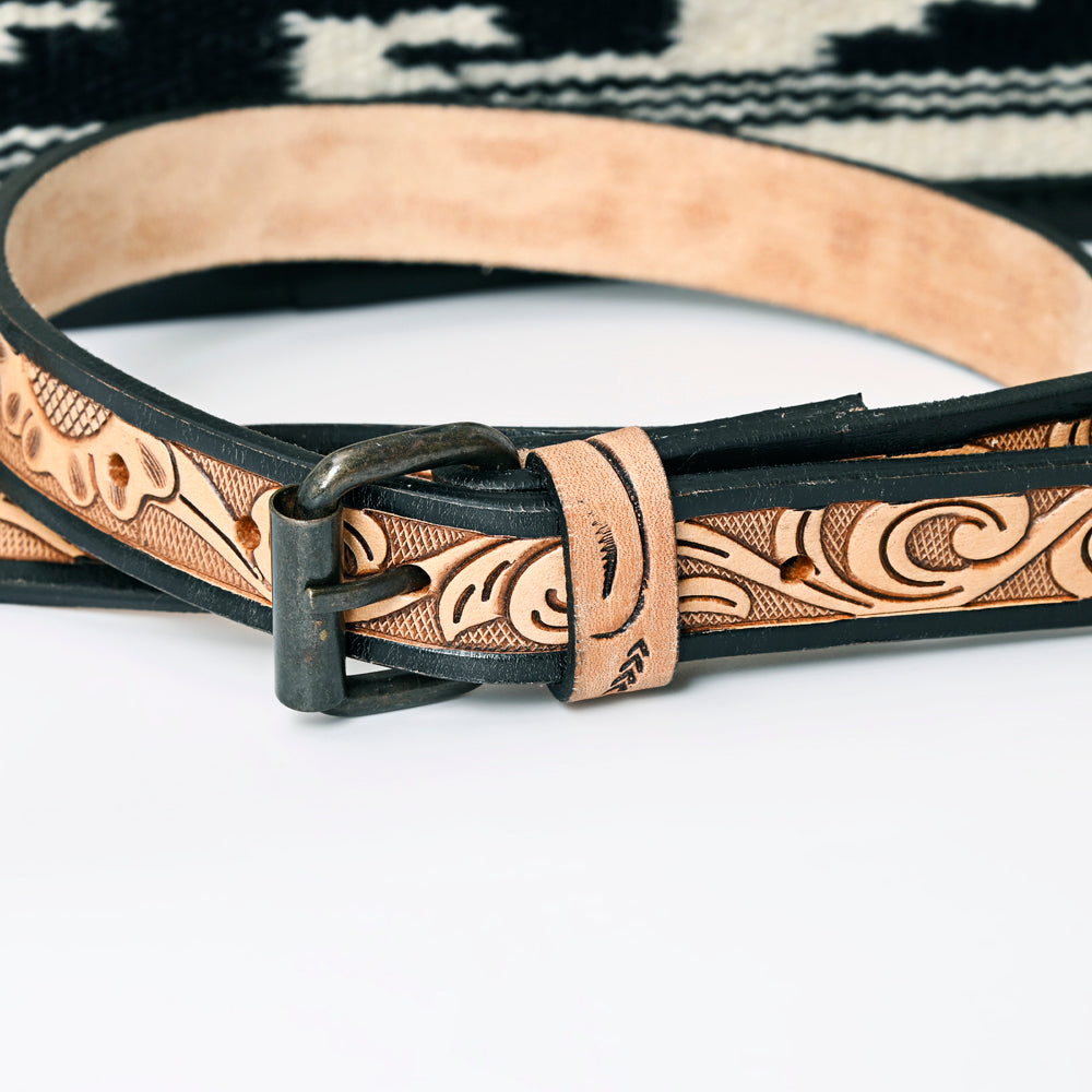 Key Features:- Features a bold hand-woven saddle blanket panel with a geometric pattern.