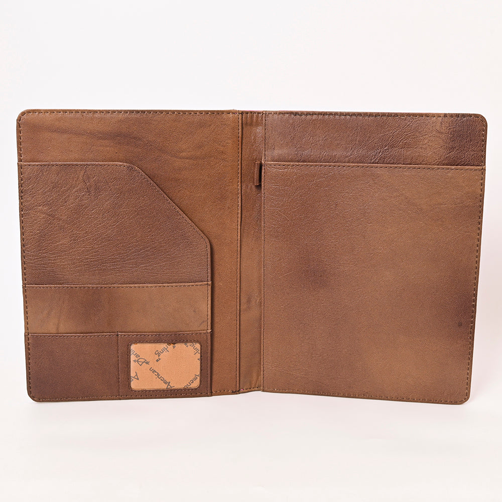 This portfolio features a beautifully hand-tooled exterior in a striking pink color, honoring traditional Western craftsmanship with a fresh modern take. Ideal for meetings, travel, and everyday organization, it offers well-planned compartments to keep essentials secure and accessible. The 12.5in (H) X 9.5in (W) size provides ample space while maintaining an elegant profile. To maintain its beauty, gently wipe with a soft dry cloth and avoid prolonged moisture exposure.
