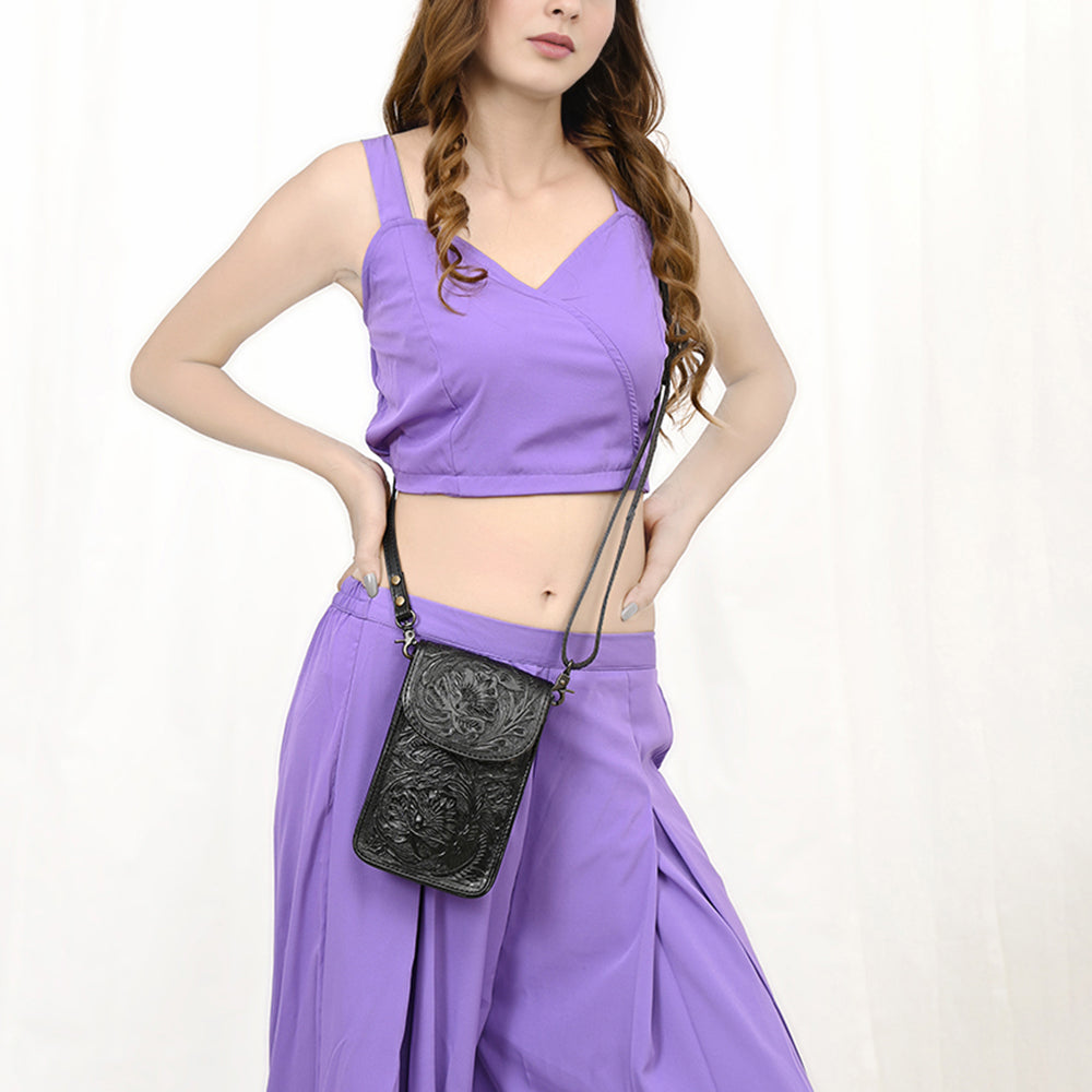 Designed with an elegant tooled exterior, this piece blends Western artistry with modern functionality. The crossbody strap ensures hands-free convenience, making it ideal for daily wear, travel, or outdoor events. Easy-care construction helps preserve its craftsmanship and Western-inspired appeal for years to come.