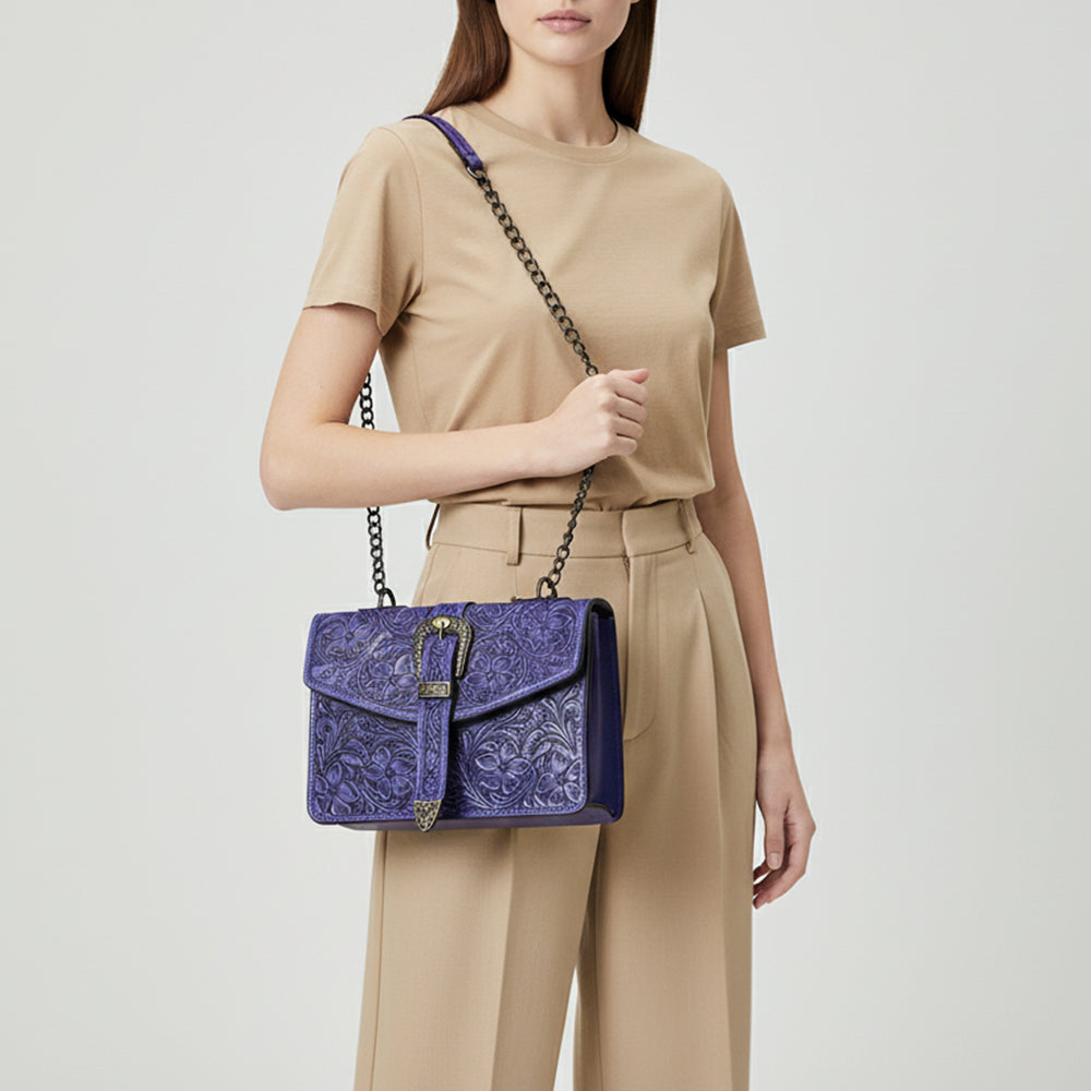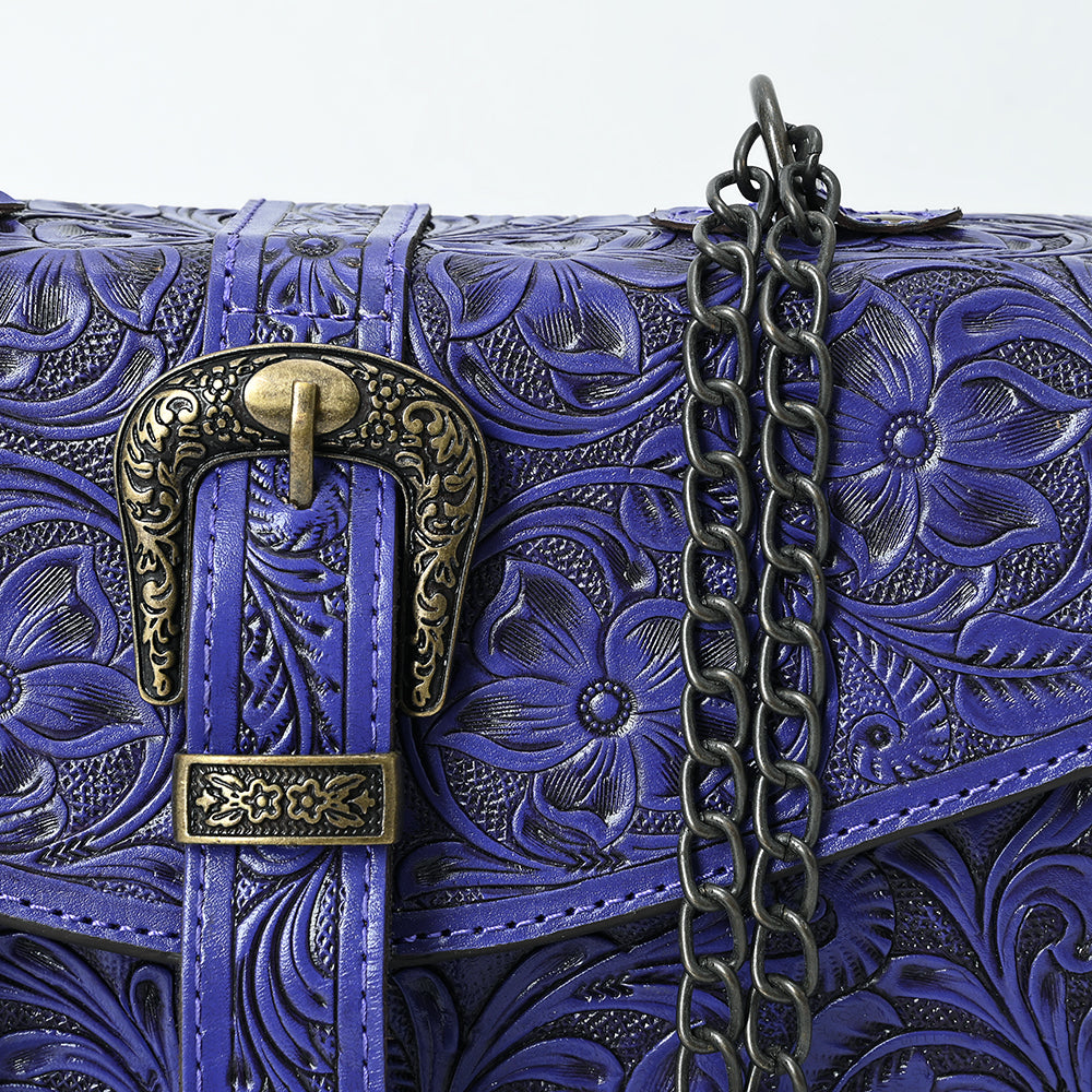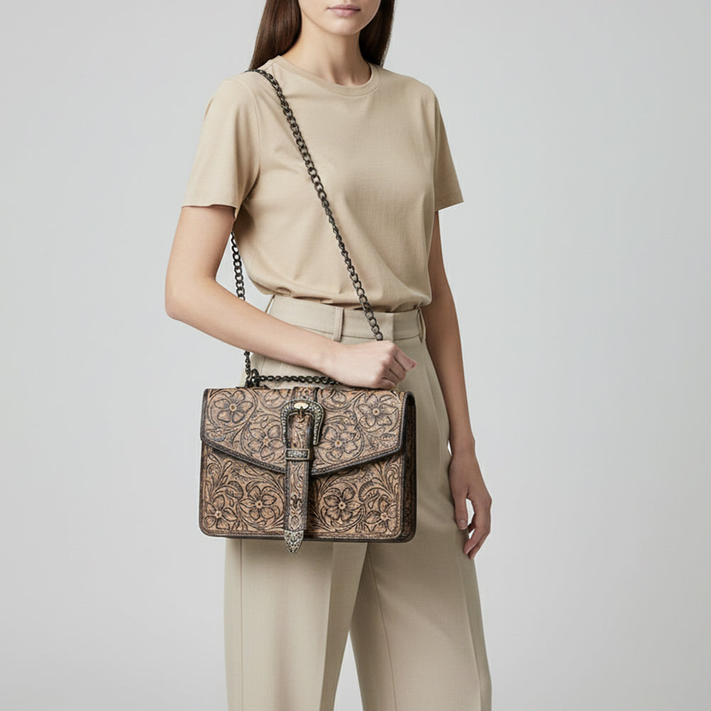 ADBG1535 American Darling Western Leather Small Crossbody Bag with Hand-Tooled Floral Design & Chain Strap