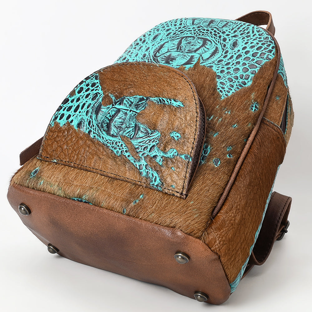 Turn heads wherever you go with this bold Turquoise Croc Embossed & Hair-On-Hide Leather Backpack, designed for the modern Western adventurer. This structured backpack blends genuine hair-on-hide leather with vibrant turquoise crocodile embossing, creating a stunning contrast of texture and color.