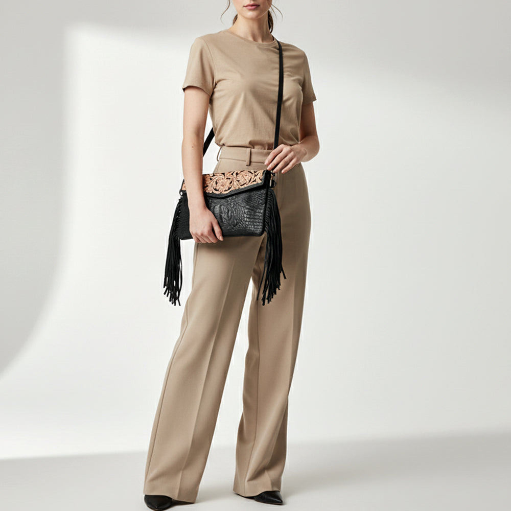 Western charm meets edgy elegance in this handcrafted black leather Clutch bag. The body features a rich croc-embossed texture, while the flap is adorned with intricate tan floral tooling that creates a beautiful contrast. Finished with long leather fringe on both sides, this bag brings bold cowgirl energy wherever you go.