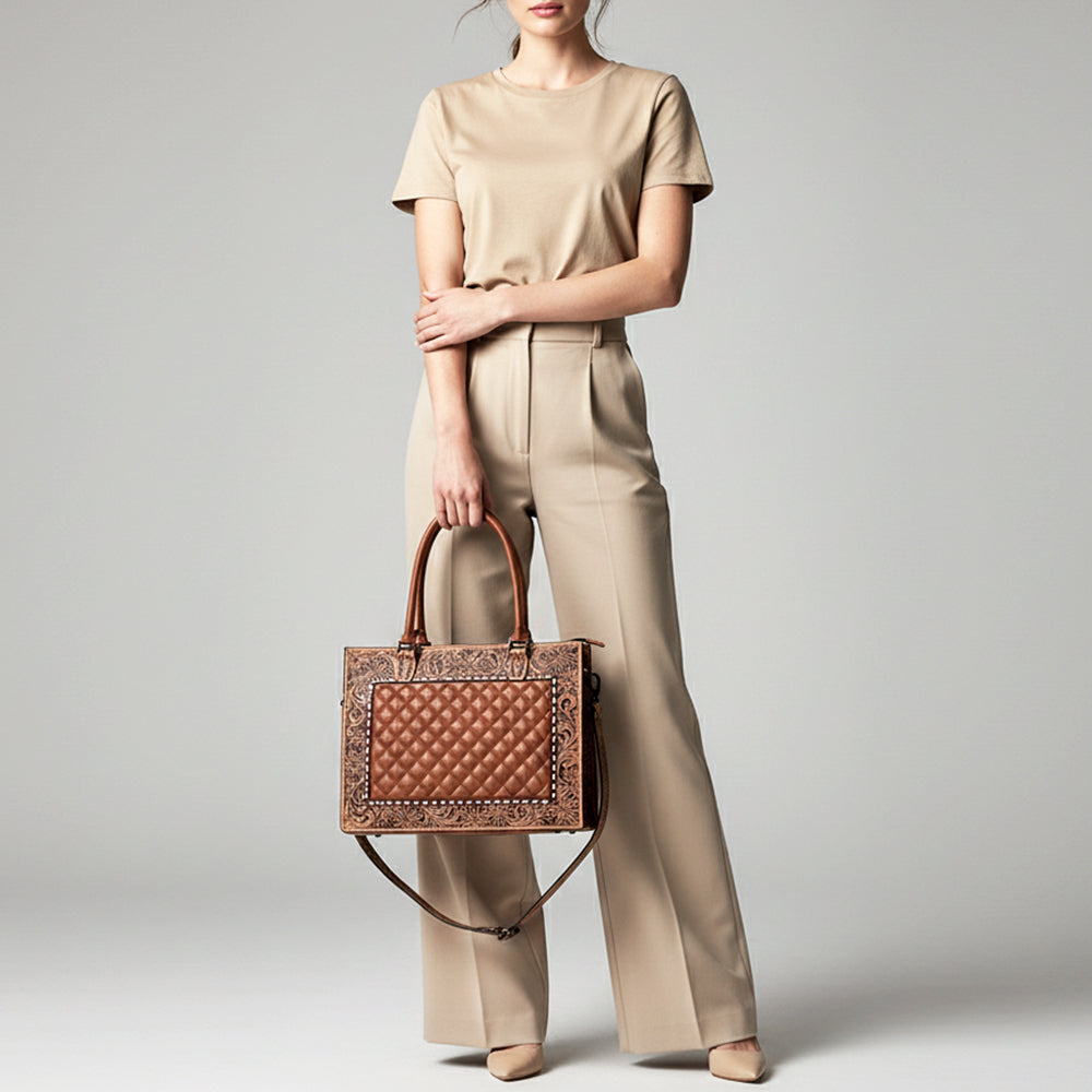 ADBG1671A Tooled Leather Quilted Western Tote Bag with Floral Strap - American Darling