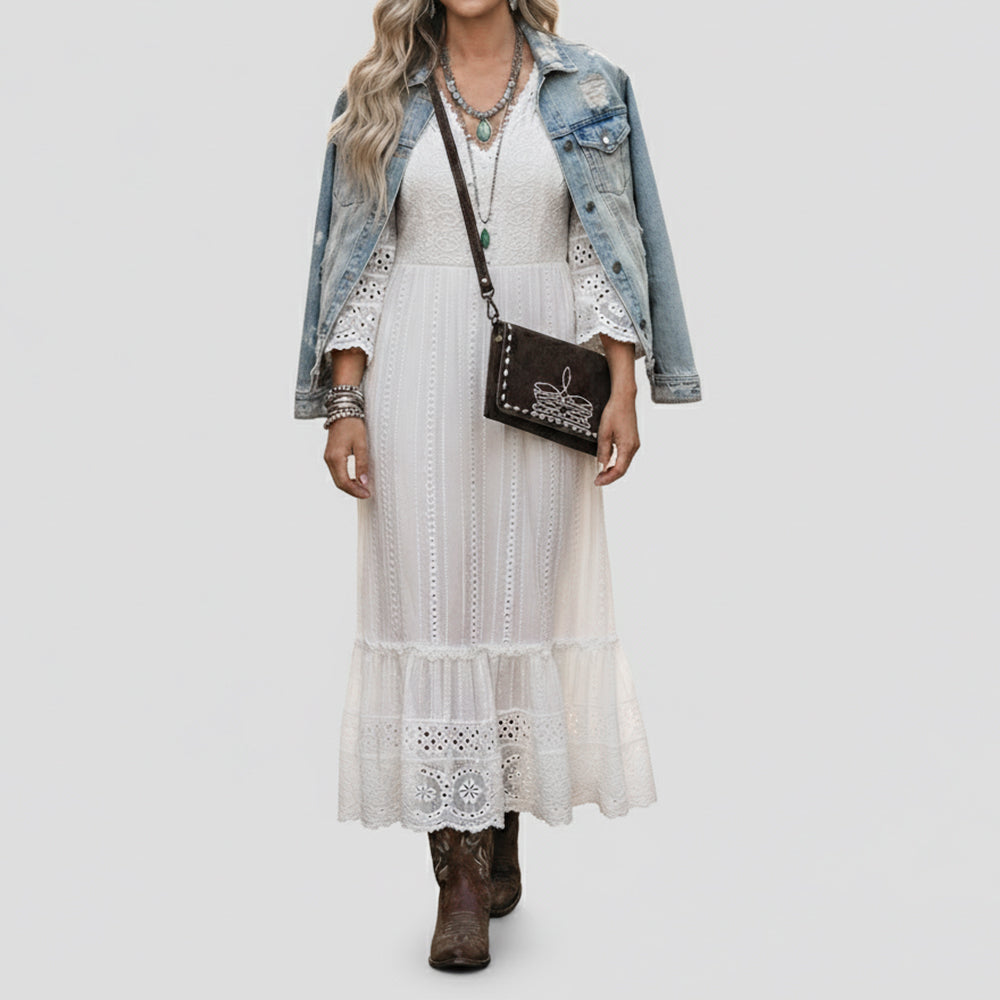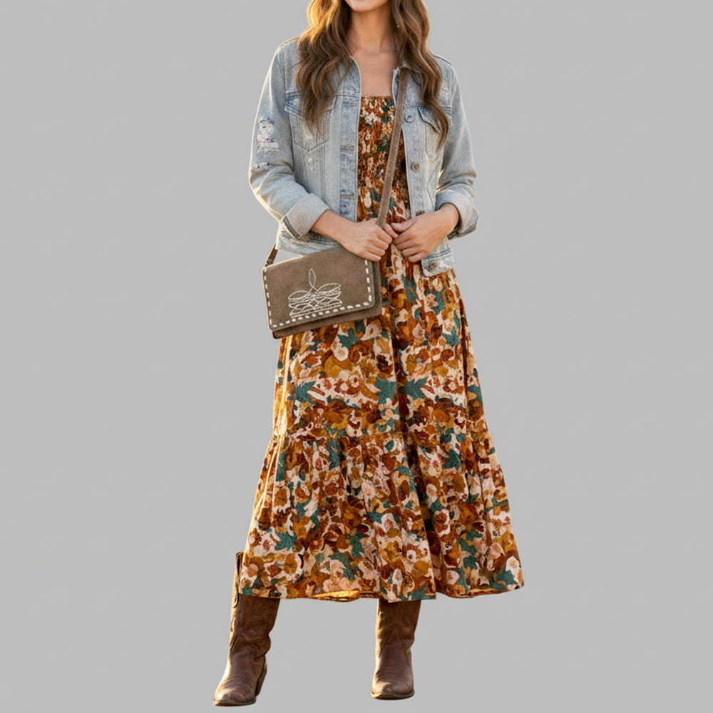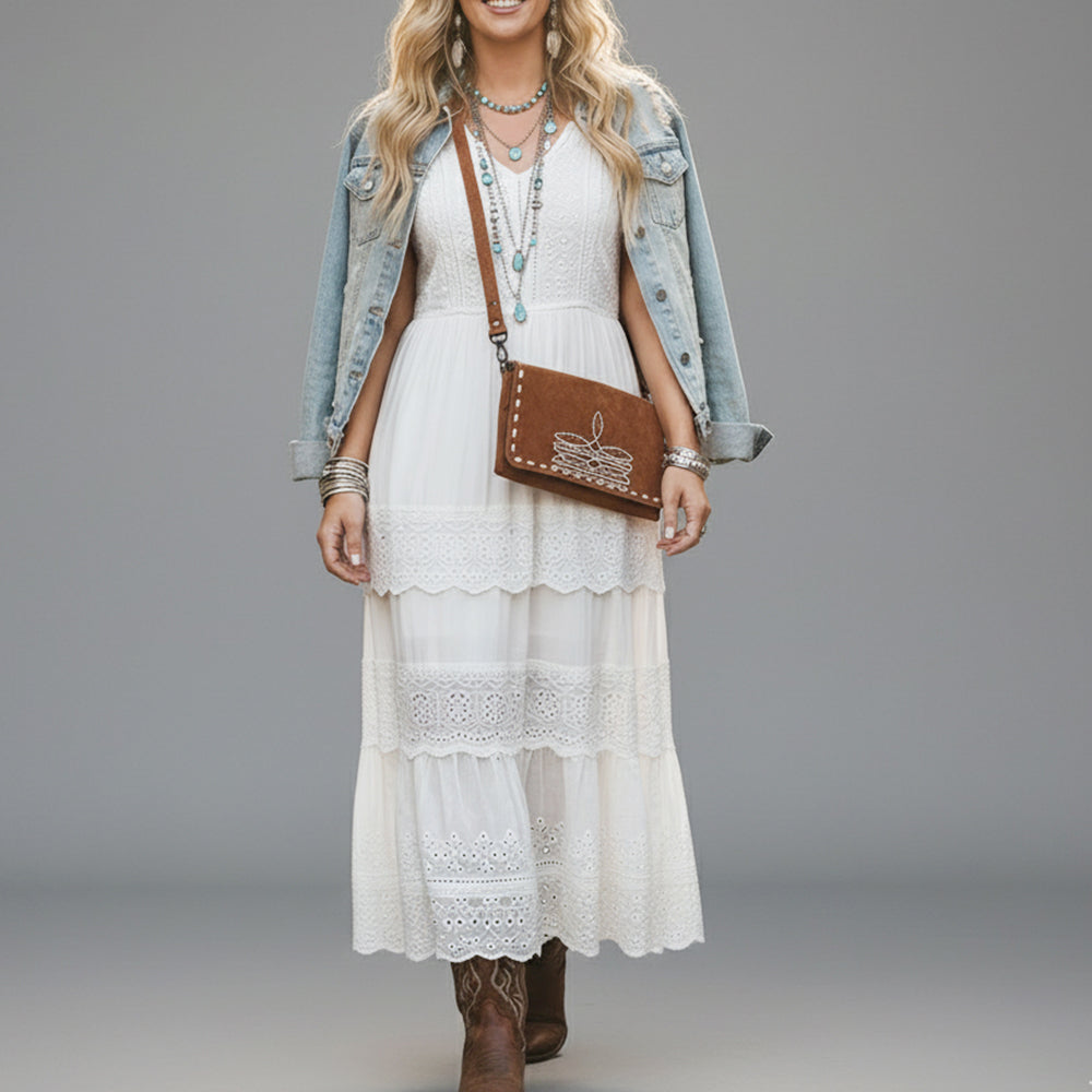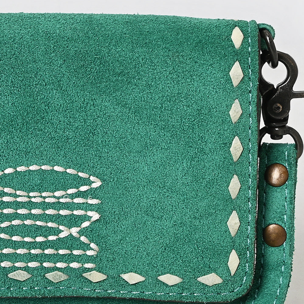 This compact genuine leather Wallet bag features classic Western charm with white whipstitch detailing and a rustic hand-sewn motif on the flap. Made from soft, durable Genuine suede-finish leather, it's the perfect lightweight accessory for everyday use. The leather strap offers comfortable hands-free wear, while the flap closure keeps your essentials secure. A blend of function and frontier-inspired style, perfect for rodeos, markets, and casual outings.