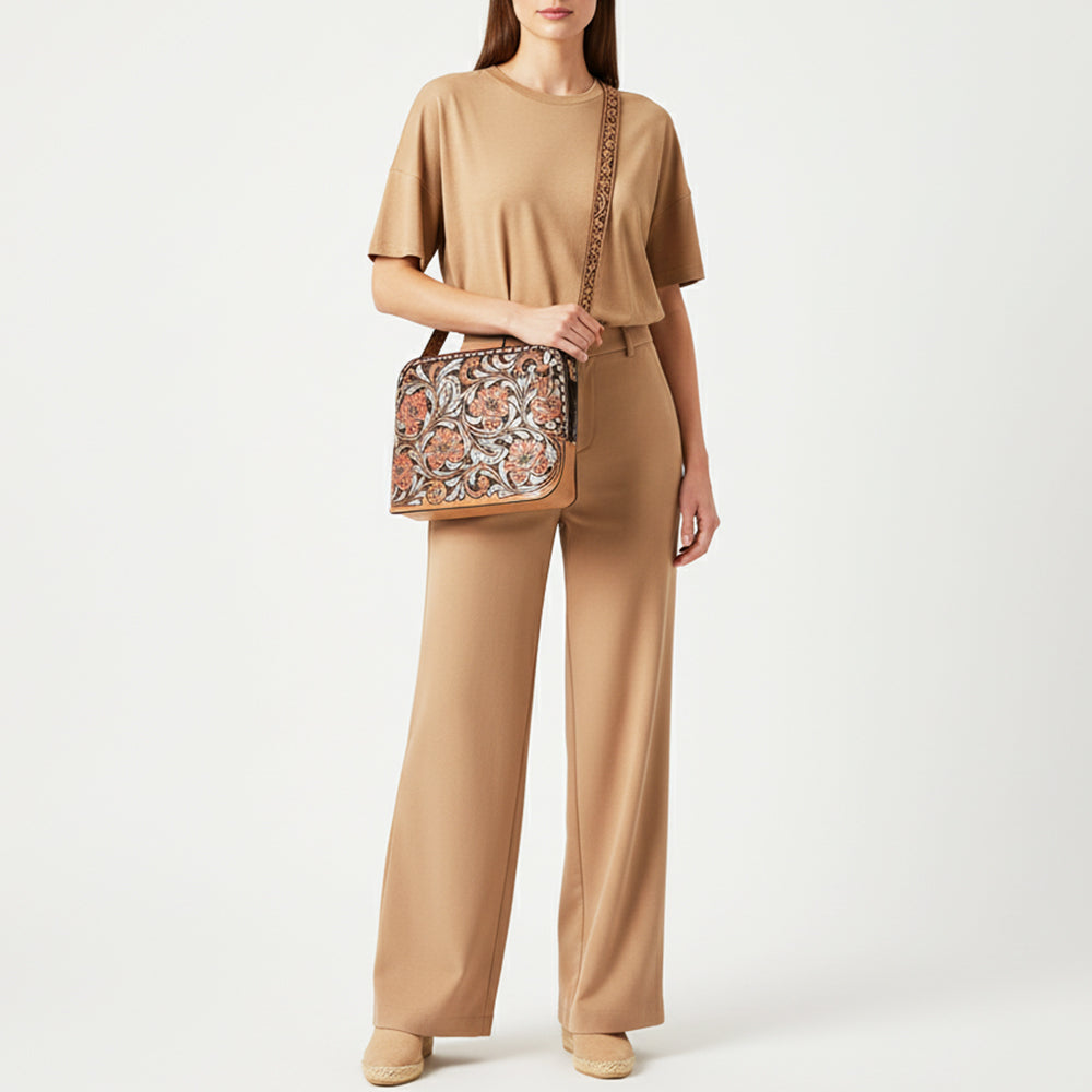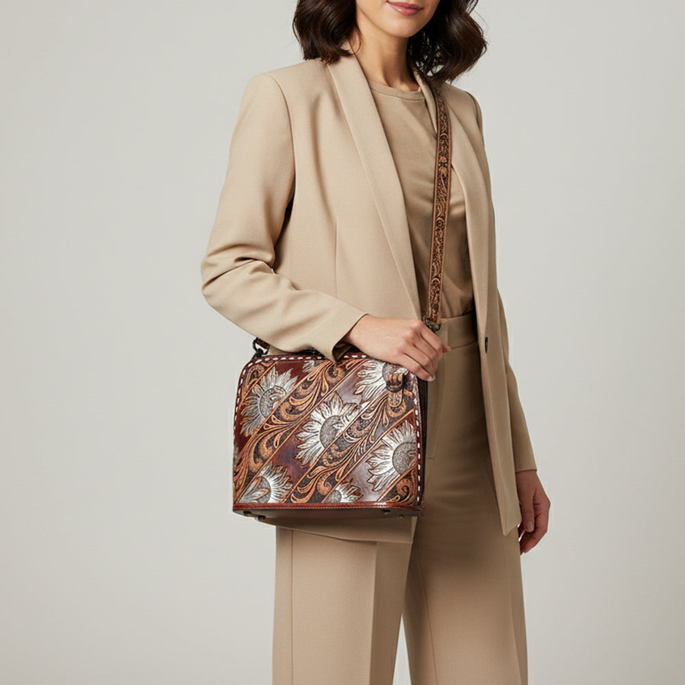 Showcase elegance with a Western twist in this beautifully crafted tooled leather crossbody bag. The front features hand-tooled leather adorned with intricate silver scrollwork and blooming floral carvings, offering a soft, feminine contrast to the bold craftsmanship. Paired with a fully tooled leather shoulder strap, this structured crossbody delivers timeless style, durability, and standout artistry.
