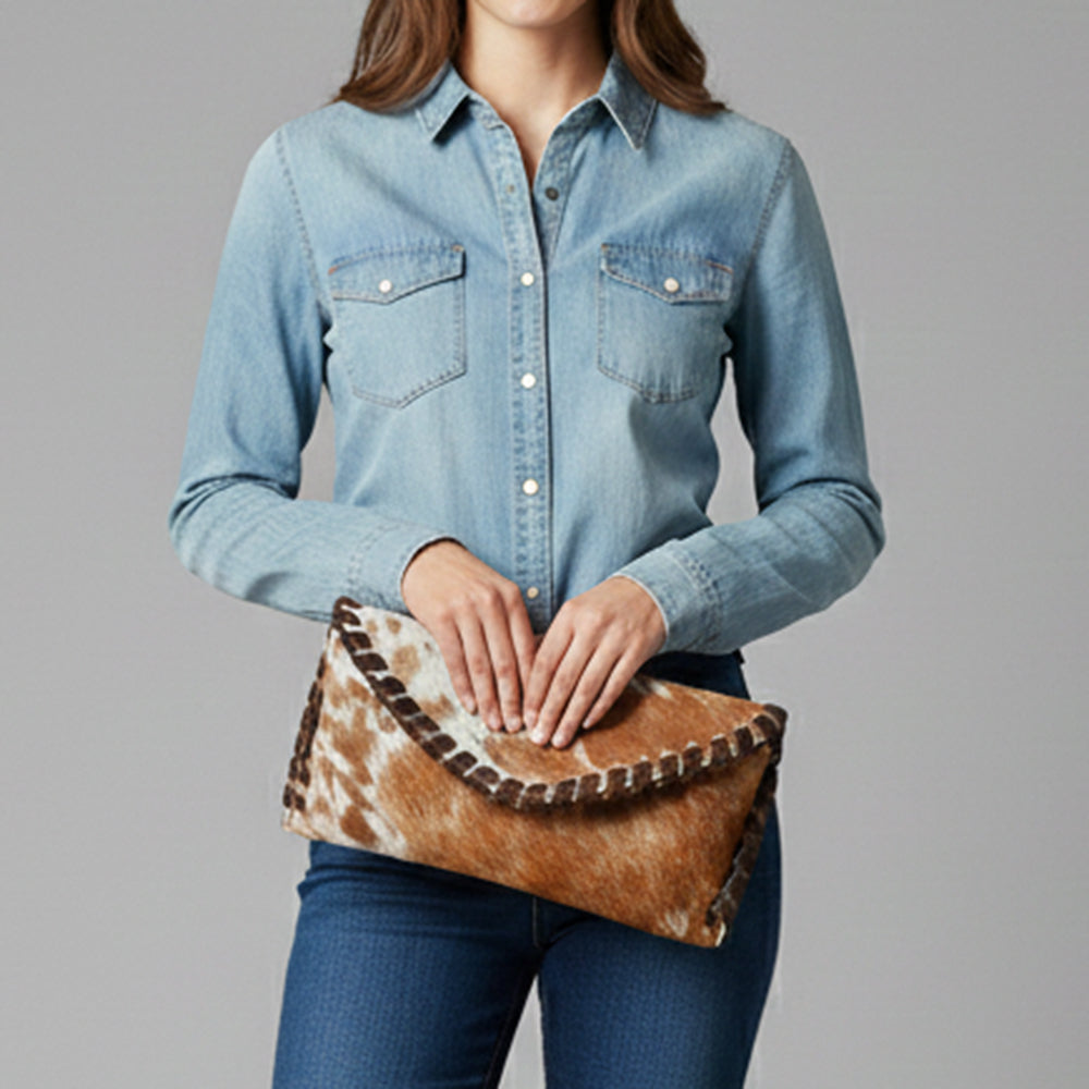 Its hair-on finish brings natural texture and unique pattern variations to each piece, making every case truly one-of-a-kind. The flap is secured with intricate hand-braided leather trim, blending both style and durability in a compact form. Whether on the road, at a rodeo, or in your handbag, this Western-inspired pouch safeguards your sunglasses in elevated style.