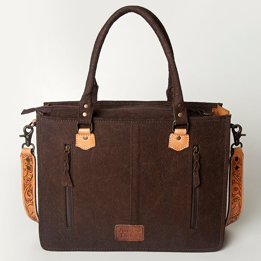 ADBG230 Hand Tooled Leather Tote Bag with Natural Floral Tooled Leather Panels & Fringes