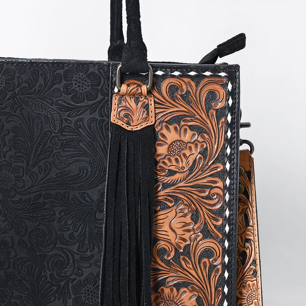 This stunning Western tote bag features genuine full-grain leather with hand-tooled floral designs on the sides and strap. The center panel is a sleek black leather embossed with subtle floral tooling, creating a beautiful contrast with the natural tan tooled leather.
