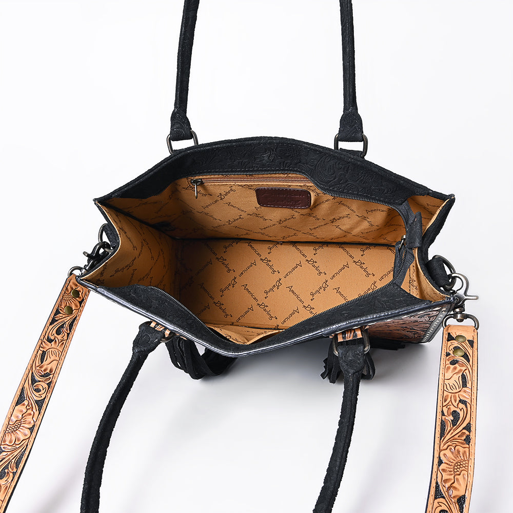ADBG230DM1 Hand Tooled Leather Tote Bag with Black Center & Natural Floral Tooled Accents